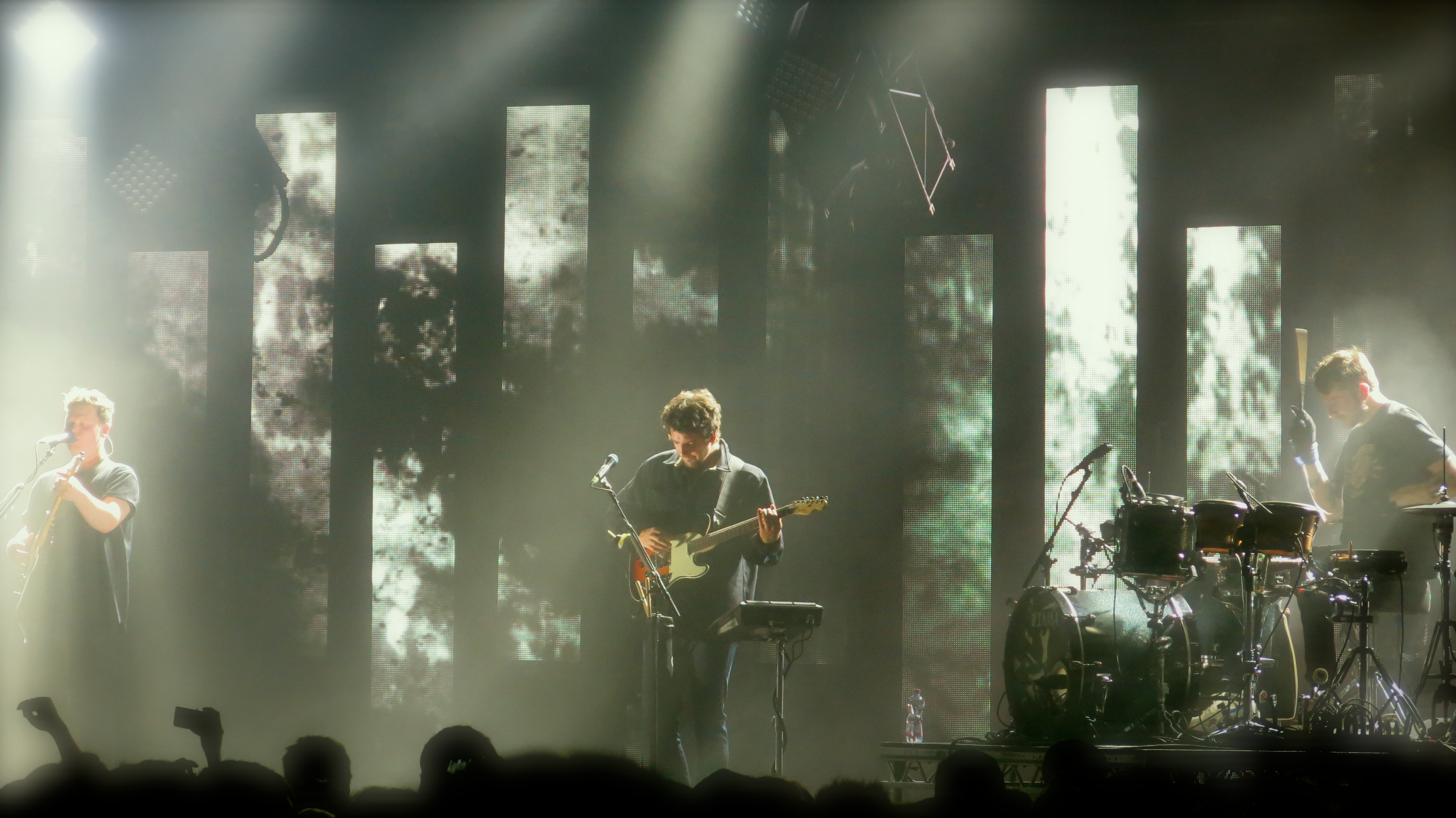 Bei solchen Bedenken wird allerdings jeglicher Sinn und Zweck verfehlt und der ist – Überraschung! – die Musik. Und die ist, egal ob Eishalle oder Flugplatz, nach wie vor das Matterhorn der Gefühle. Angefangen hat das Konzert mit „Hunger Of The Pine“. Danach folgten (erstaunlich) viele Songs der ersten Platte, „An Awesome Wave“. Hits wie „Matilda“, „Something Good“, „Taro“, „Tesselate“, „Dissolve Me“ etc. wurden nach und nach abgearbeitet. Die Songs hatten jedoch – und da merkte man wie gut alt-J als Liveband funktionieren – immer einen anderen Twist. Die Gitarre klang einmal lauter (bei „Something Good“) oder verträumte Synthies überschwammen ein altbekanntes Lied (bei „Matilda“).