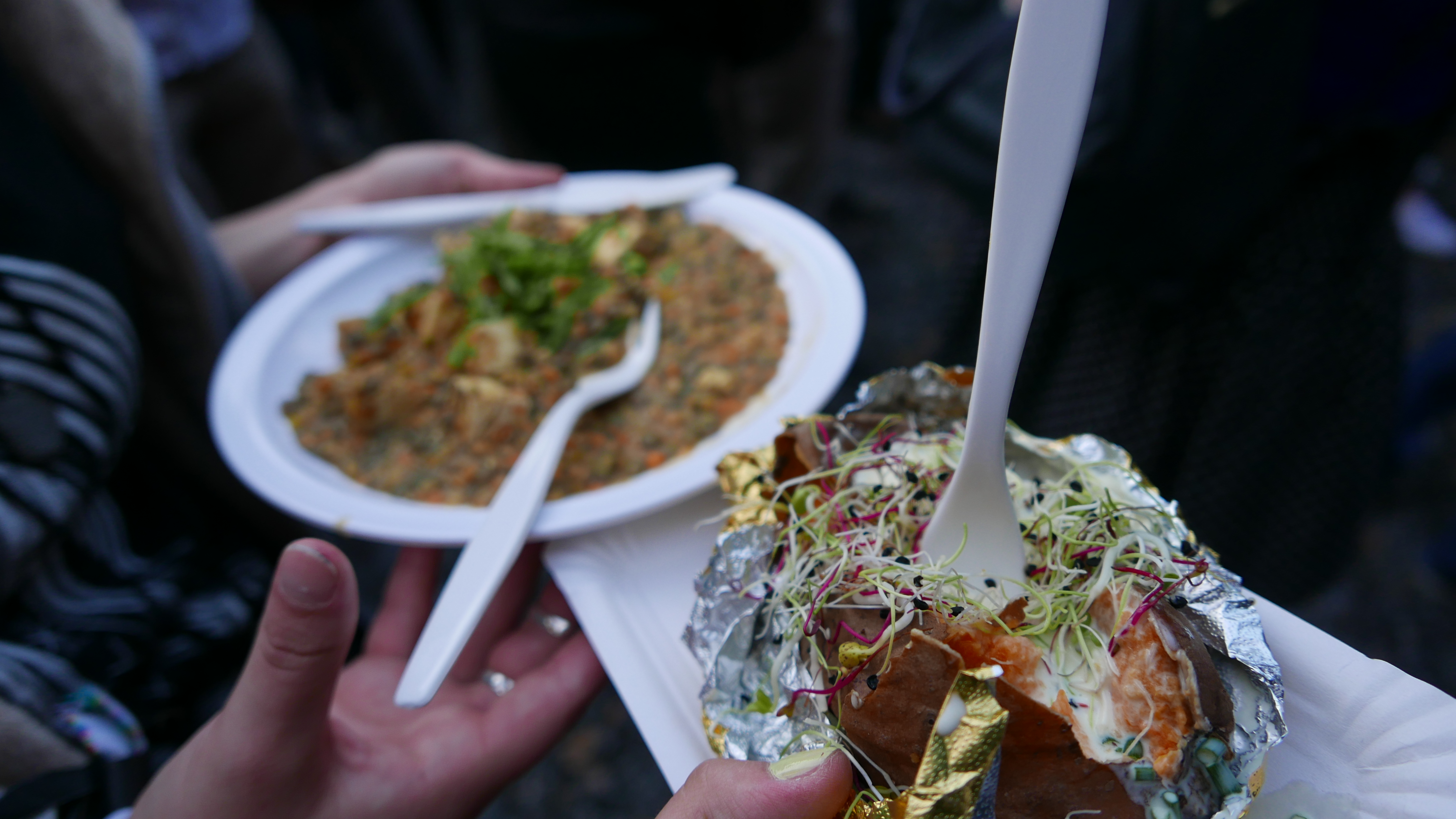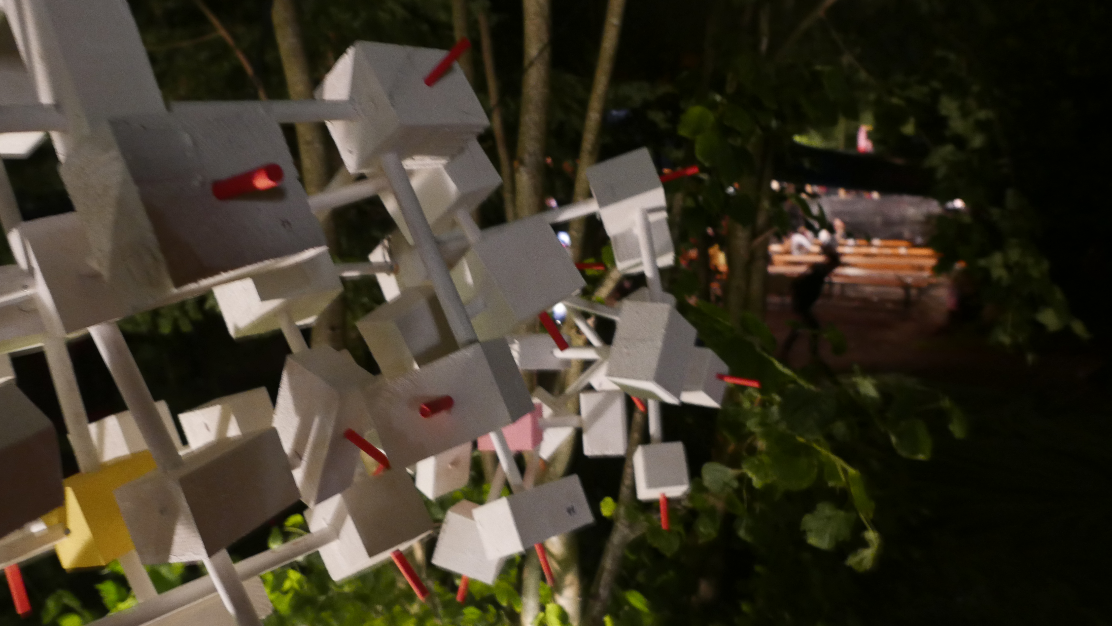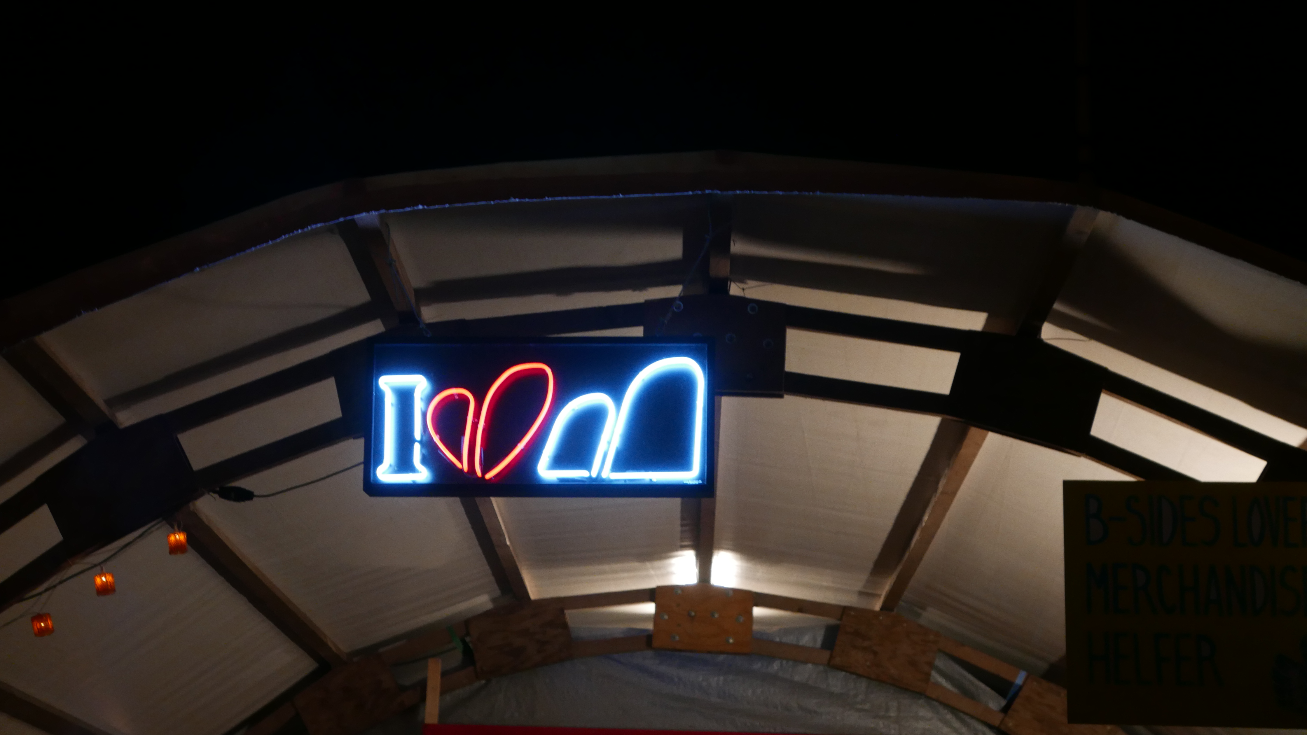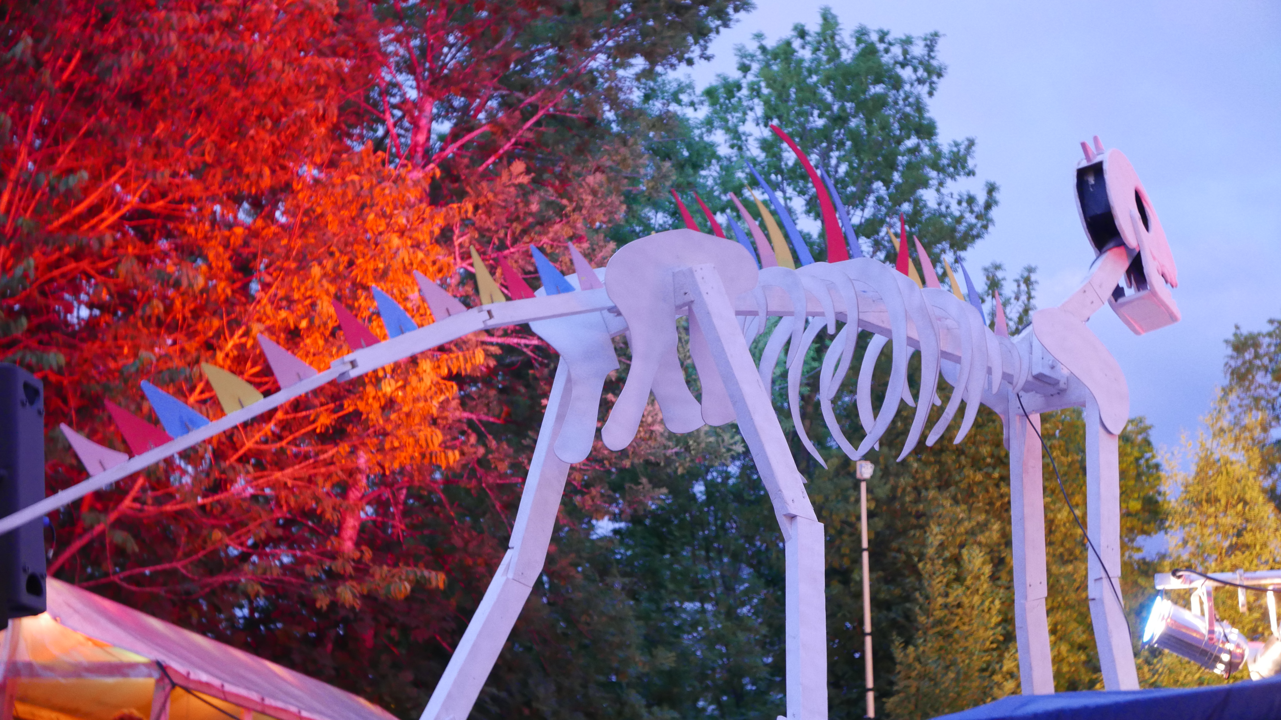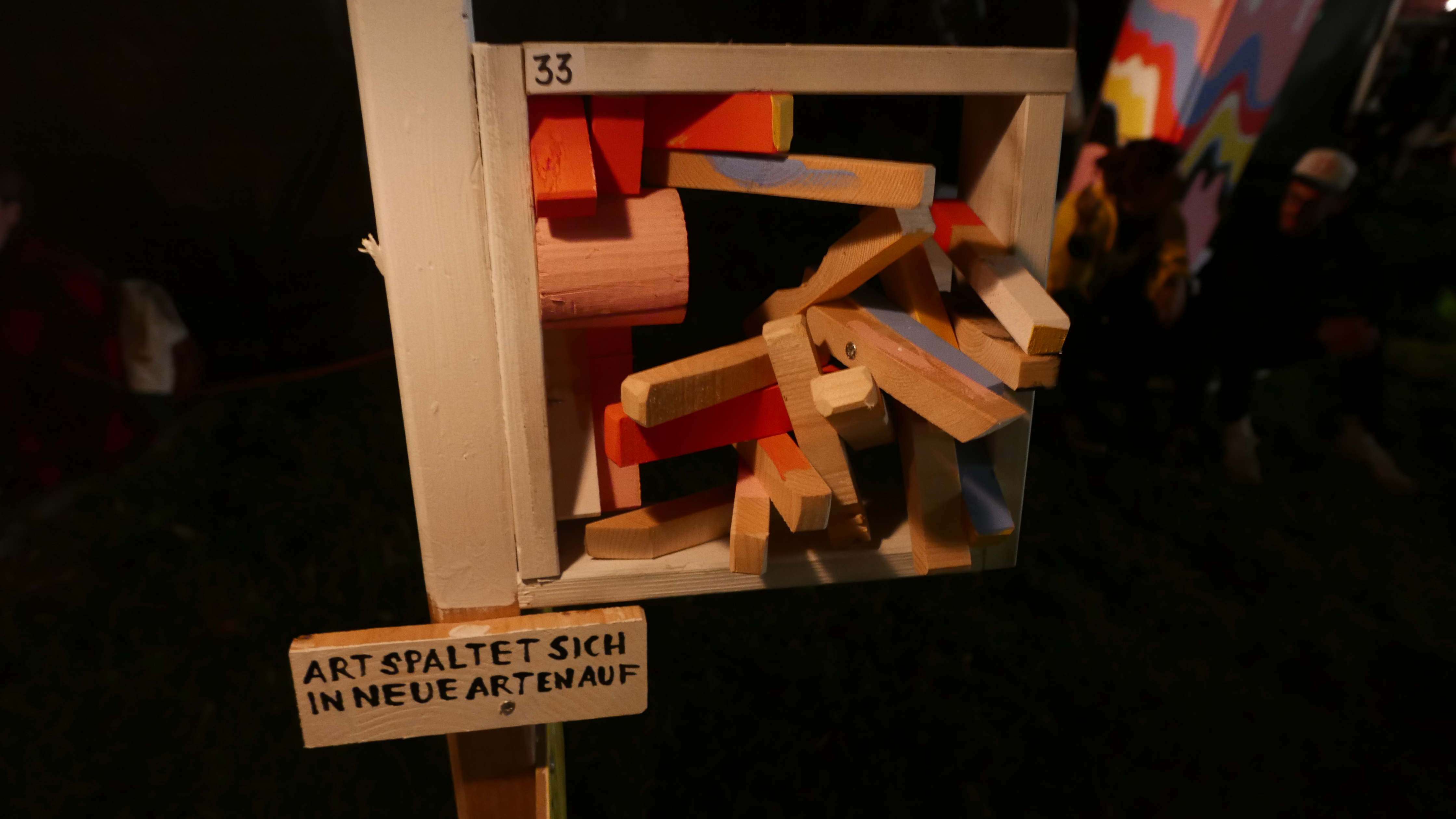 Nebst der vielen Konzerte, gab es noch weitere Attraktionen am B-Sides Festival. Die Kunst war kaum zu übersehen und dennoch im Detail verborgen. So war eine alte Pfanne zu einem Aschenbecher umfunktioniert worden. Ein Dinosaurierskelett hing über den Dächern. Kunstvoll arrangierte Holzteilchen wurden zu Jenga-ähnlichen Türmen zusammengebaut und mit Sprüchen verziert. (Am besten gefiel: „Art spaltet sich in neue Arten auf.“) Die gesamte Kunst konnte man am Merchandise-Stand ersteigern. So ist das B-Sides nebst dem Musikfestival-Teil auch ein Kunstauktion. Forget Art Basel.